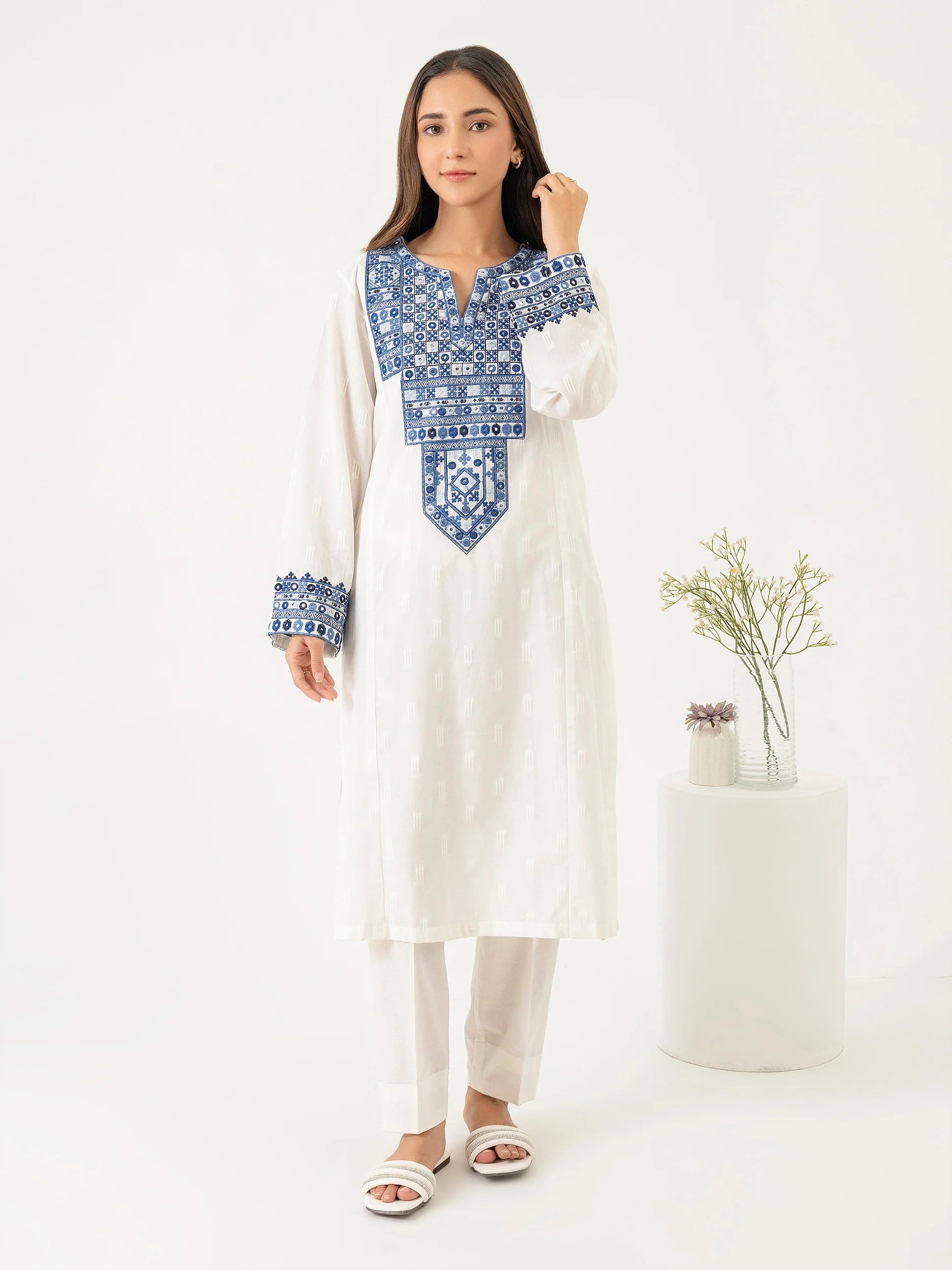 Shirt Dyed embroidered shirt Fabric: Lawn Trouser Dyed narrow leg trouser with elasticized waistband Fabric: Cambric Other Details Weight: 366 g Model is wearing size "S"