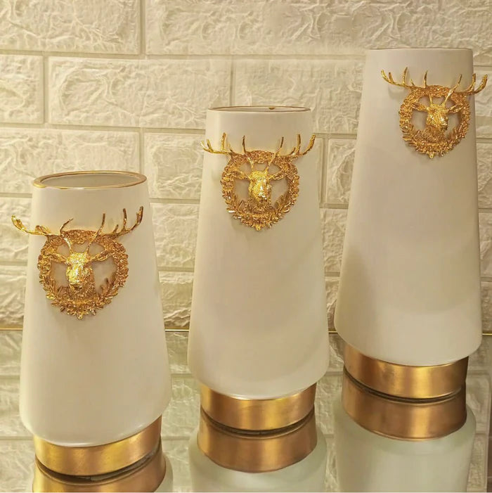 Elevate your decor with our Ceramic Gold Plated Reindeer Vase. Crafted with exquisite detail, this elegant piece combines the charm of a reindeer with the luxury of gold plating, making it a stunning centerpiece for any space.