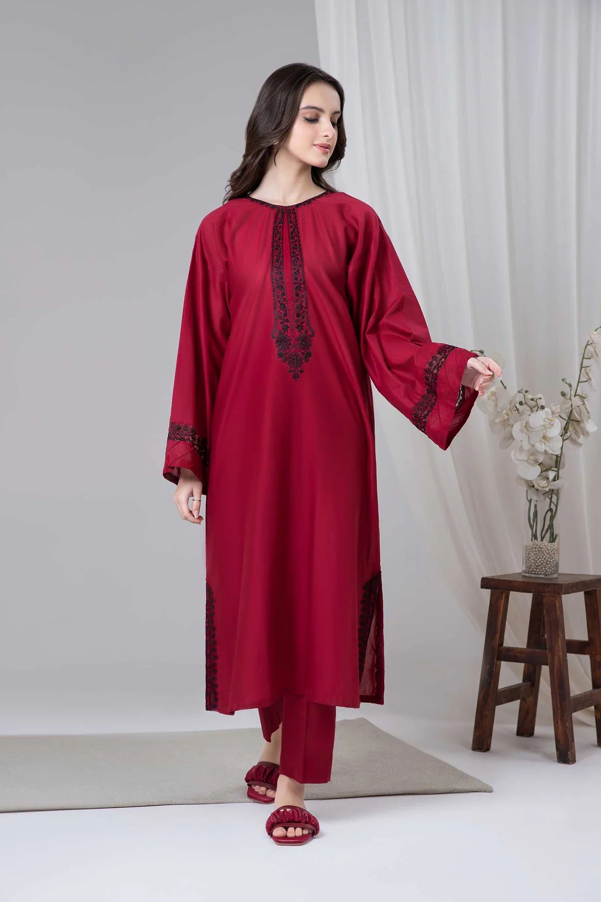 Stand out with our dyed lawn shirt featuring a maroon canvas adorned with floral embroidery and pleat detailing.