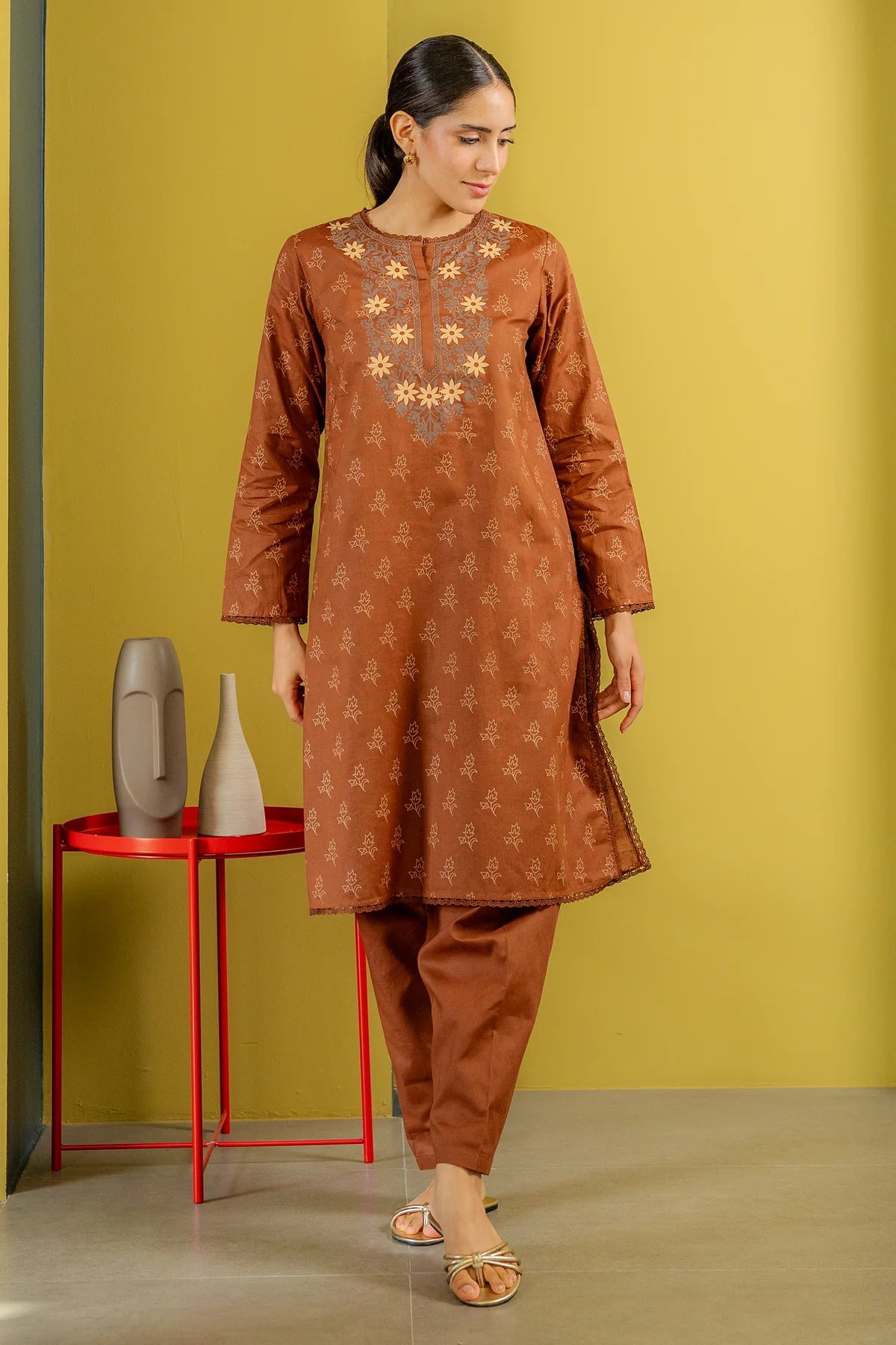 Brown hand screen print kurta paired with shalwar