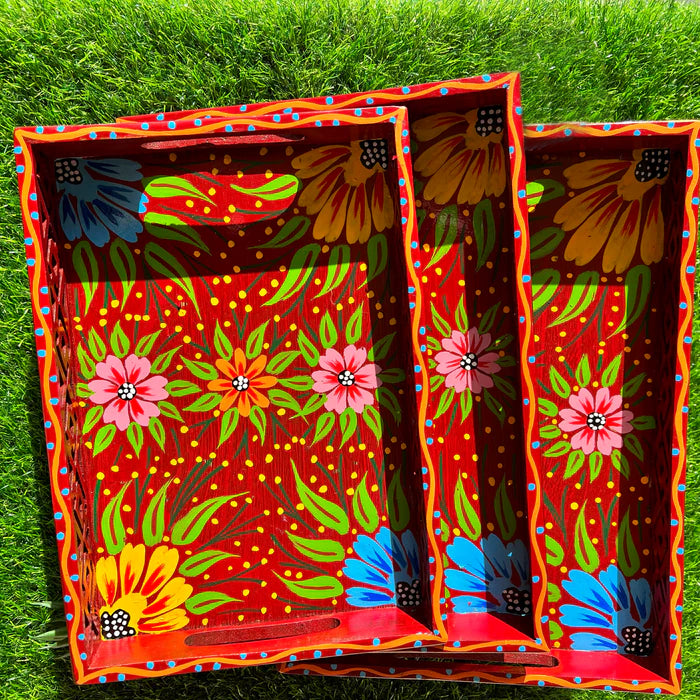The truck art tray set in red color is a beautifully designed collection of trays inspired by traditional Pakistani truck art. Each tray features intricate, colorful designs that are hand-painted with great attention to detail. The set includes three different sizes of trays that are perfect for serving food and drinks or for use as decorative pieces in your home. The bold red color of the trays adds a pop of color to any space and makes them a great addition to any home decor.