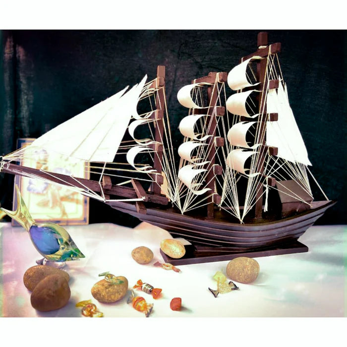 This hand-carved wood model of a sailing ship is a meticulously crafted and detailed replica of a historical vessel that embodies the charm and elegance of traditional sailing ships.