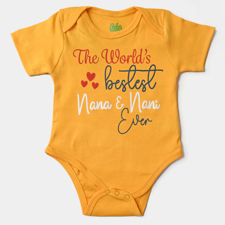 Half-sleeved bodysuit in soft cotton interlock with printed design and press studs at the crotch.