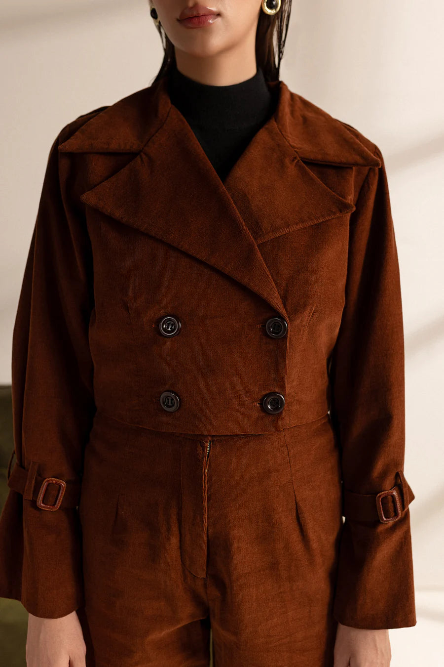 This elegant brown corduroy set features a cropped double-breasted trench jacket that exudes timeless sophistication. The jacket is tailored with a wide lapel collar and adorned with functional buttons, creating a structured and polished silhouette. The warm brown tone enhances the luxurious texture of the corduroy fabric, while adjustable buckle straps on the sleeves add a touch of versatility and edge to the design.