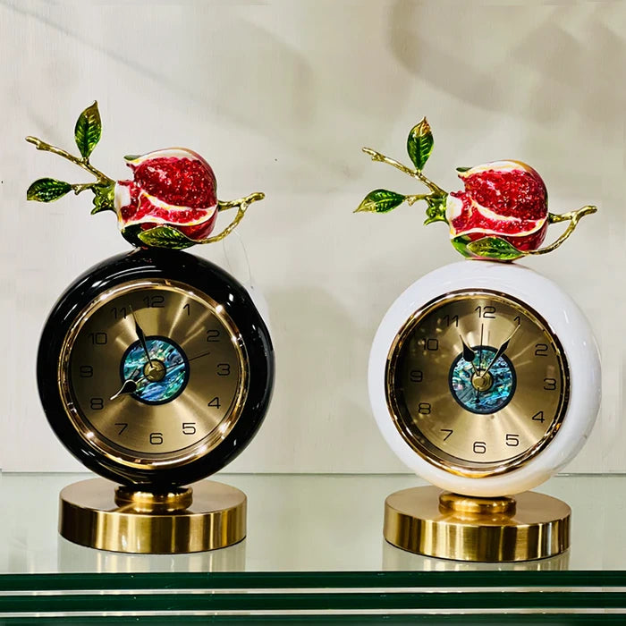 The Pomegranate Designed Metal Table Clock showcases an artistic, nature-inspired design. Crafted with durable metal, it features intricate pomegranate motifs and reliable timekeeping, making it a charming and unique addition to any decor store or home setting.