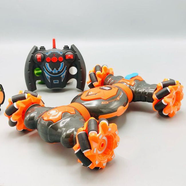 • Whether it's grass, sand, or pavement, this RC stunt car is ready for the challenge.