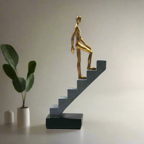 Dynamic resin statue of a man walking up stairs, embodying determination and progress. With bold strides and a resolute expression, this striking piece conveys a sense of purpose and ambition. Perfect for home or office decor, it inspires motivation and adds a touch of modern sophistication to any space.
