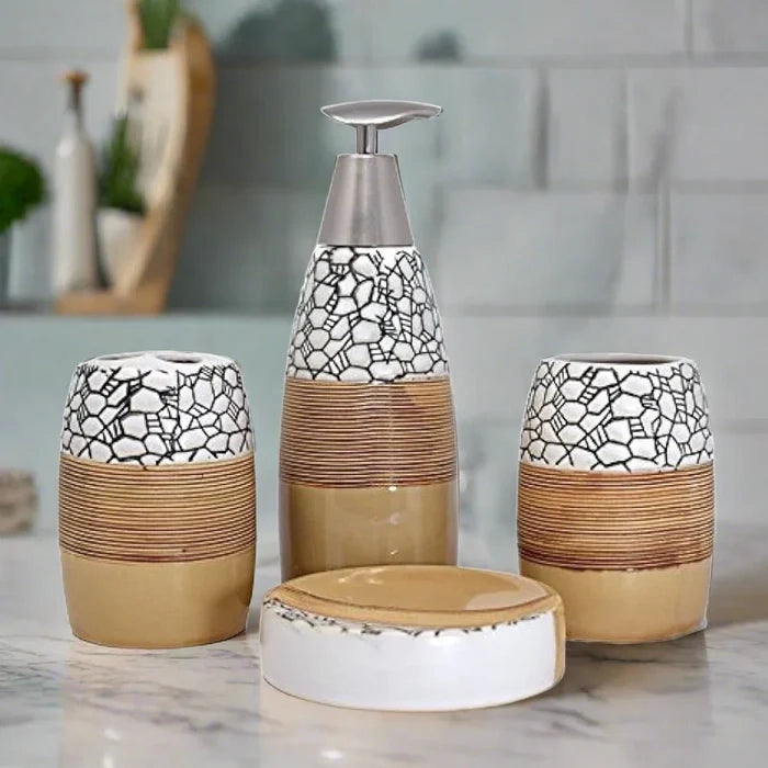 Enhance your bathroom with the SELF TEXTURED BATH SET. This four-piece set includes a soap dispenser, toothbrush holder, tumbler, and soap dish, each featuring a distinctive self-textured design that adds a modern and sophisticated touch to your decor.