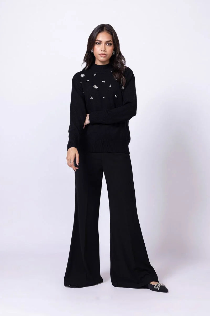 Description: A short crew neck sweater with full sleeves, featuring a floral design.