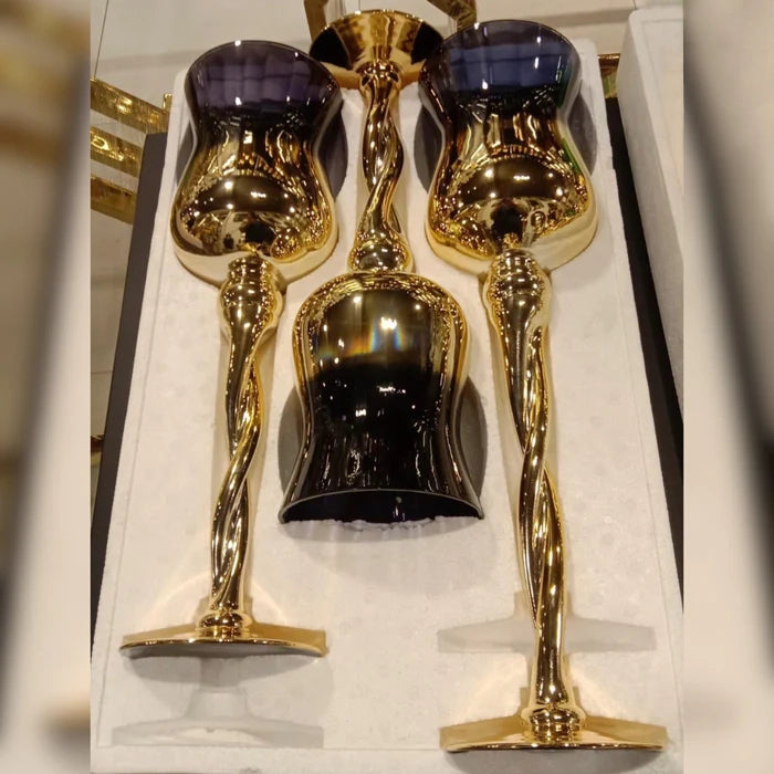 Three wine-style vases are made of glass and have a Navy Blue and golden color, the first vase is 16 inches long, the second vase is 14 inches long, and the third vase has a length of 10 inches. These vases are widely used in hotels, homes, or restaurant décor.