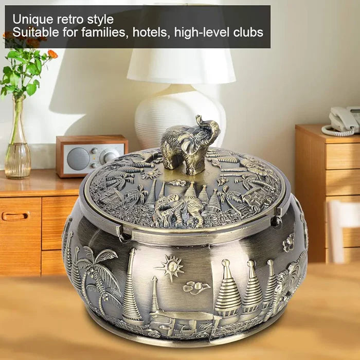 A vintage ashtray with a lid, perfect for adding a touch of retro charm to any space. Ideal for decor, it combines functionality with a stylish design, making it a unique conversation piece for homes or classic-themed interiors.